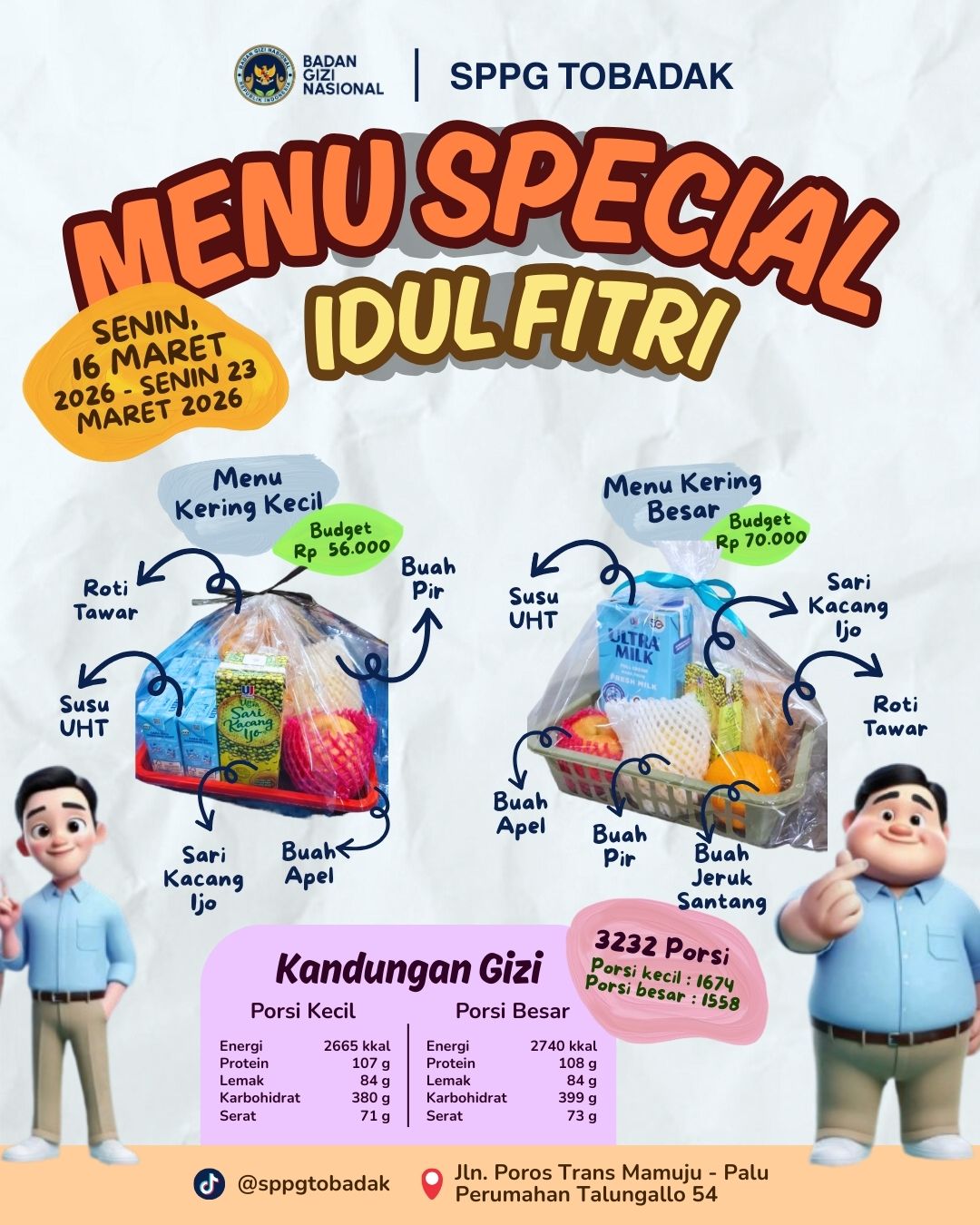 Menu yang dibagikan merupakan paket makanan kering bergizi yang disiapkan khusus dalam rangka menyambut Idul Fitri. Untuk porsi kecil, paket berisi roti tawar, susu UHT, sari kacang hijau, buah apel, dan buah pir. Sementara porsi besar memiliki tambahan buah jeruk santang sehingga memberikan variasi nutrisi yang lebih lengkap.