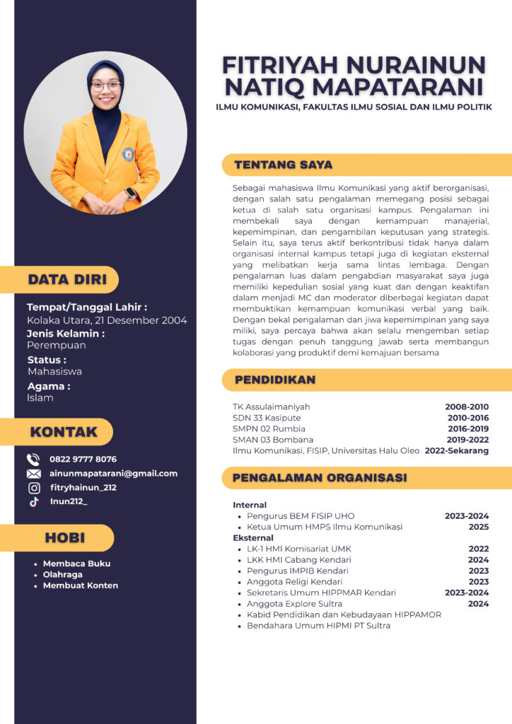 Fitriyah Nurainun Natiq Mapatarani, mahasiswi Ilmu Komunikasi Fakultas Ilmu Sosial dan Ilmu Politik (FISIP) Universitas Halu Oleo, tampil sebagai satu-satunya kandidat perempuan dalam kontestasi Presiden Mahasiswa UHO tahun ini. Melalui wawancara via sambungan telepon, Sabtu (7/12/2025), Fitriyah menyampaikan tekad dan alasan kuat di balik keputusannya maju dalam pemilihan tersebut.
