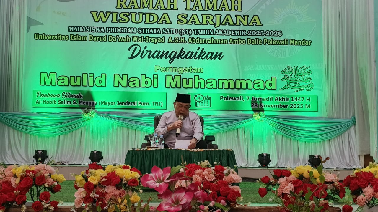 Polewali Mandar, Mediasebangsa.com — Suasana penuh kekhidmatan menyelimuti pelaksanaan ramah tamah wisuda sarjana Strata Satu (S1) Universitas Islam DDI A.G.H Ambo Dalle Tahun Akademik 2025–2026, yang berlangsung di Gedung Gabungan Dinas (Gadis) Polewali Mandar, Jumat (28/11/2025). Kegiatan ini sekaligus dirangkaikan dengan peringatan Maulid Nabi Muhammad SAW.